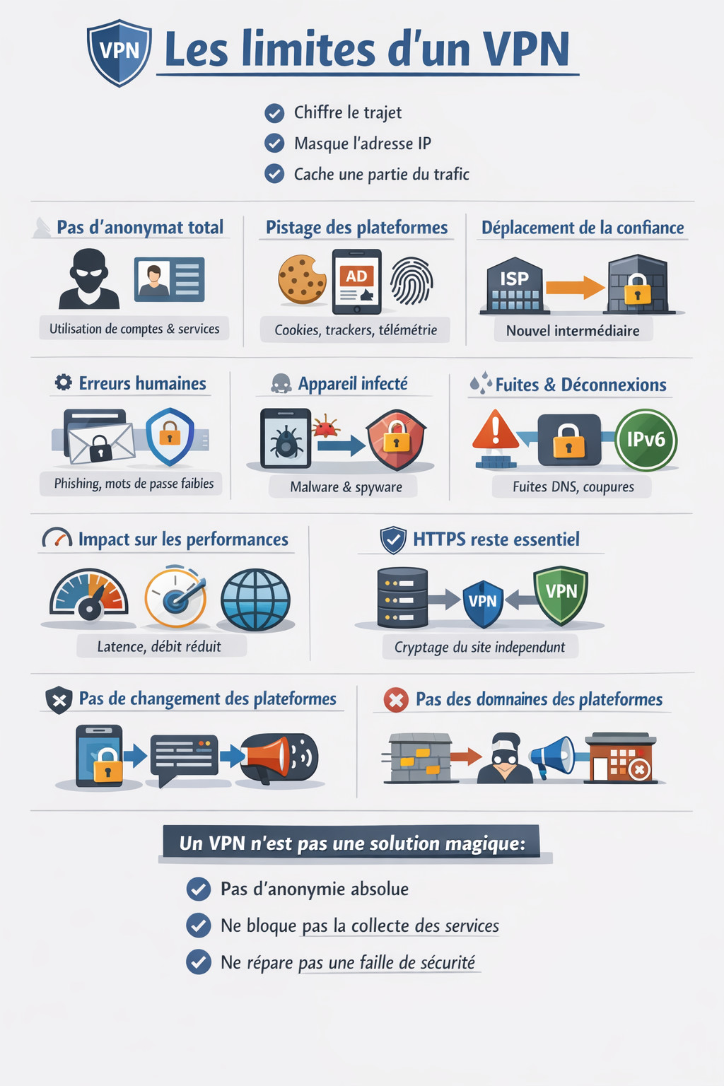 Les limites d’un VPN sont nombreuses et structurantes. Il ne rend pas anonyme, ne bloque pas à lui seul le pistage des plateformes, ne corrige pas les erreurs humaines, ne désinfecte pas un appareil compromis, peut mal se comporter techniquement, peut dégrader certains usages et ne vaut pas la même chose selon le contexte réseau ou l’appareil utilisé.